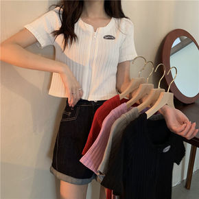 夏装2022年新款韩版纽扣开衫显瘦百搭V领短袖黑色...