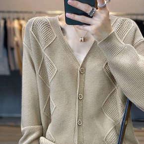 22秋冬7针菱形加厚扭花针织开衫V领长袖百搭外套女...
