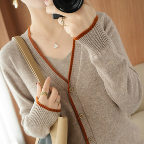 2022秋冬新款女装长袖V领毛衣开衫女拼色毛衣外套...