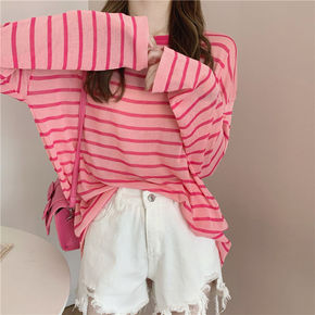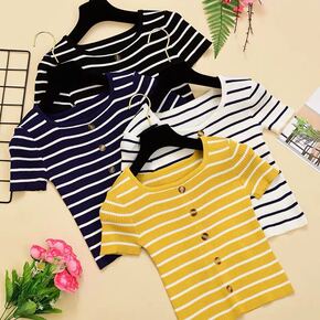2020夏季ins超火条纹方领上衣女高腰短款冰丝针...