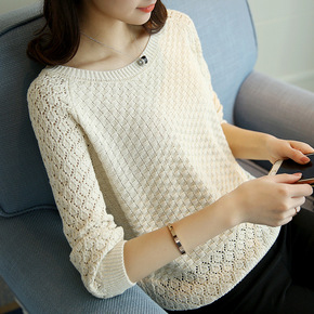 春夏新品圆领套头蕾丝拼接针织衫女韩版宽松薄款长袖毛...