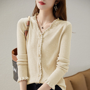 2021年秋冬新款时尚气质v领木耳边薄款开衫毛衣外...