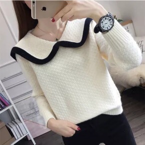 2021秋冬新款宽松外穿娃娃领短款针织毛衣女慵懒风...