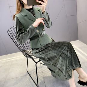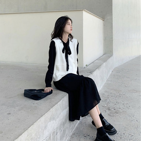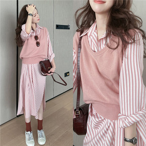 网红 2020秋季时尚针织马甲+衬衫连衣裙减龄时尚...