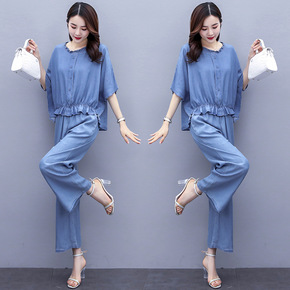 宽松阔腿裤套装女夏2021新款大码女装天丝牛仔蝙蝠...