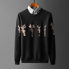 秋季薄款毛衣男士圆领打底长袖宽松春秋装上衣假两件针...