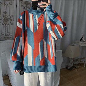跨境出口 秋季新款提花高领毛衣男士 日系宽松青年休...