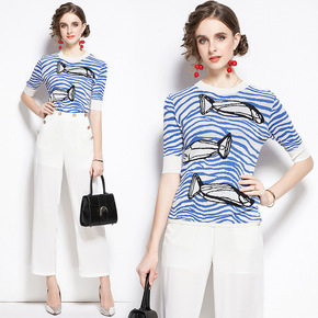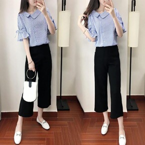 秋气质通勤气质裤套装衬衫条纹高腰针织蓝色短袖棉女装...