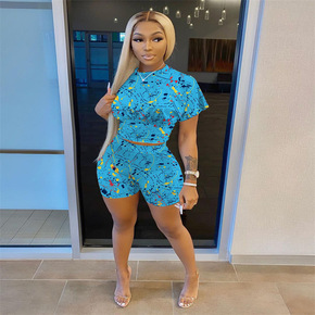 CM181 亚马逊爆款 欧美时尚印花休闲套装 短袖...