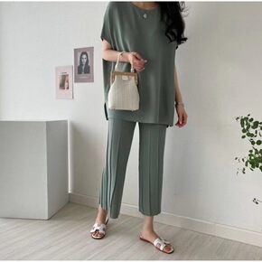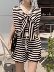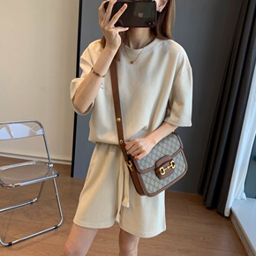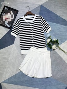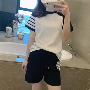 tb拼色冰丝针织时尚套装女夏季四条杠短袖T恤+宽松...