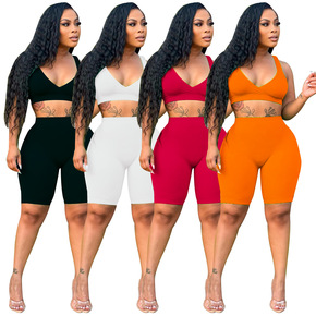 跨境欧美亚马逊独立站女装春夏秋纯色运动收腰套装时尚...