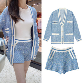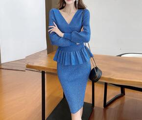 欧美休闲时尚2件套女式V领长袖宽松针织上衣高腰提臀...