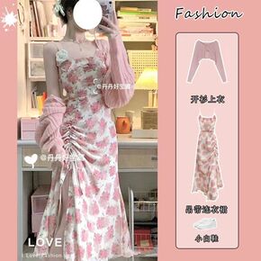 套装女2022夏季新款温柔风碎花吊带裙收腰显瘦长裙...