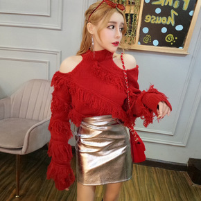 网红时尚两件套装女装洋气套头露肩性感流苏加厚针织衫...