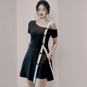 跨境2021夏款名媛气质拼色斜领吊带性感露肩开叉修...
