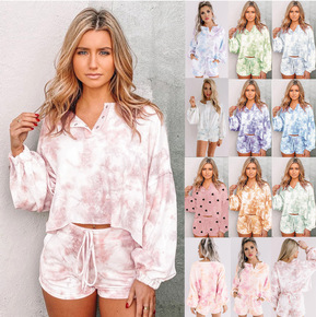 2020欧美新款家居服2件套扎染印花宽松T恤套头长...