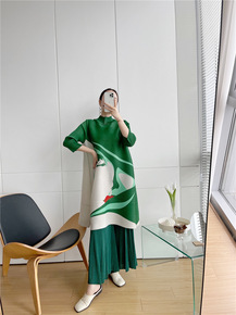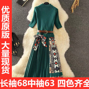 针织毛衣拼接丝绒百褶大摆过膝长裙南瓜色连衣裙...