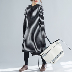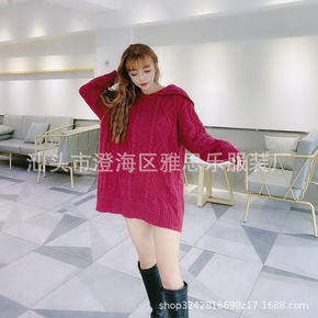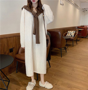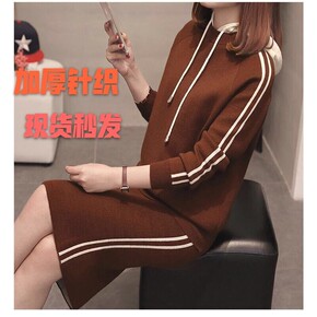 2021春秋新加长款过膝连帽宽松慵懒风针织连衣裙竖...