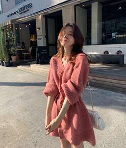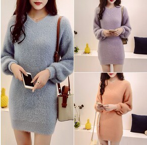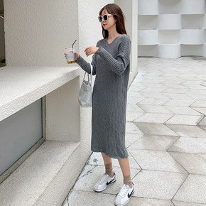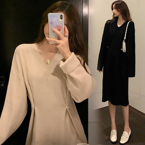 2020秋装女韩版v领毛衣连衣裙中长款长袖套头针织...
