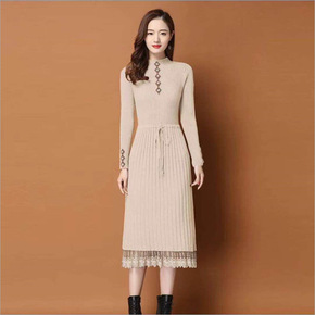 毛衣裙春秋季2019新款女装韩版宽松中长款蕾丝领针...