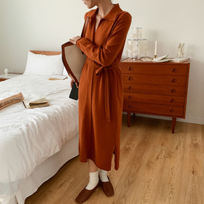 2021秋冬韩版新款中长款连衣裙圆领过膝内搭收腰打...