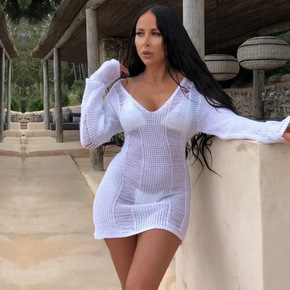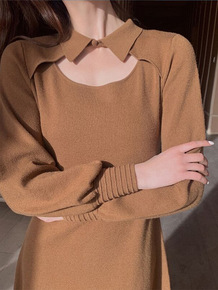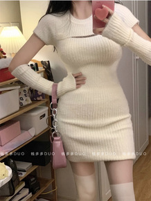 纯欲风针织毛衣连衣裙性感显胸修身镂空小个子包臀短裙...