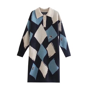 2021冬季新品欧美风撞色菱形格提花翻领长袖针织套...