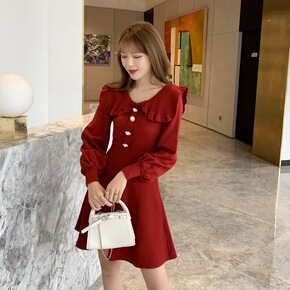 2022春款连衣裙法式甜美荷叶边拼接长袖针织衫女2...