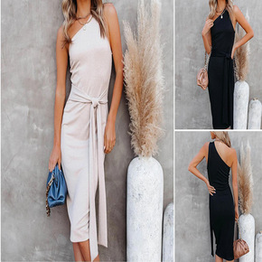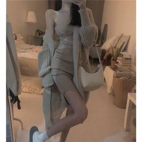 春季裙子纯欲韩系挂脖显瘦性感长裙+慵懒口袋粗线毛衣...