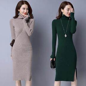 秋季保暖针织衫堆堆领长袖打底衫宽松修身显瘦连衣裙冬...