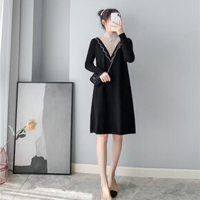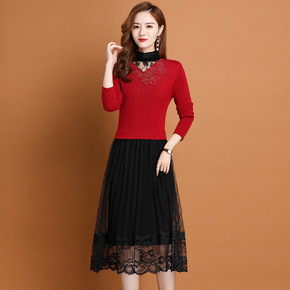 冬季配大衣打底连衣裙女秋冬新款洋气蕾丝边毛衣裙中长...