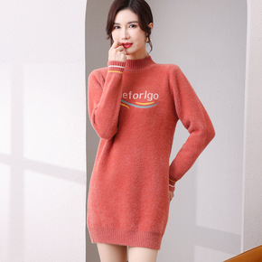 水貂绒连衣裙女秋冬加绒加厚冬季半高领中长款毛衣女咖...