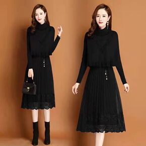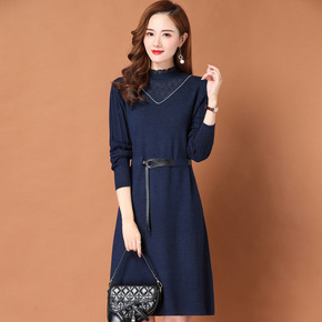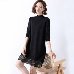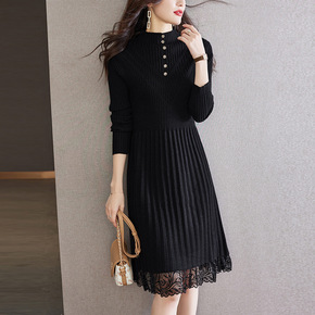 冬季打底连衣裙女秋冬配大衣内搭收腰蕾丝半高领毛衣裙...