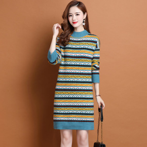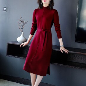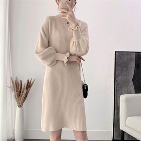 加厚半高领中长款针织连衣裙直筒毛衣裙秋冬小个子温柔...
