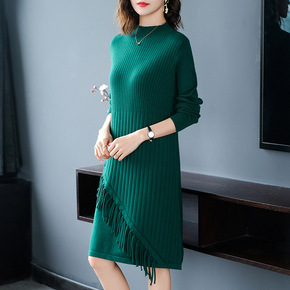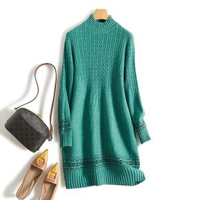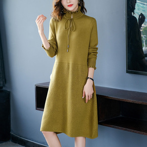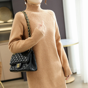 全羊毛针织连衣裙女秋冬新款半高领套头宽松中长款羊毛...
