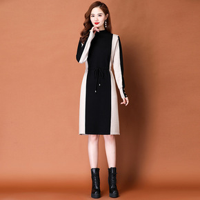 秋冬连衣裙新款套头毛衣裙女半高领竖条纹抽绳中长款针...