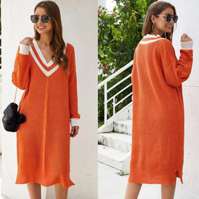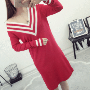 秋冬新款韩版女针织长袖连衣裙宽松显瘦v领中长款毛衣...