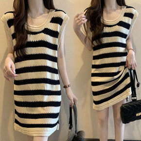 大码女装宽松遮肚圆领针织衫夏季胖妹妹洋气减龄无袖条...
