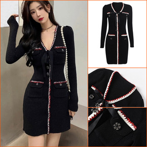气质V领长袖毛衣连衣裙女欧货设计感个性链条双排扣针...