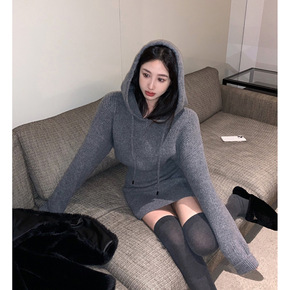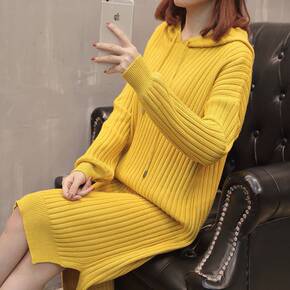 连帽毛衣连衣裙女收腰显瘦内搭打底包臀短裙2021冬...