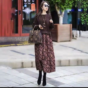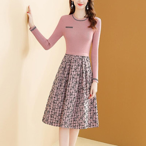 包邮2021秋冬新款时尚大码女装连衣裙毛衣拼接菊花...