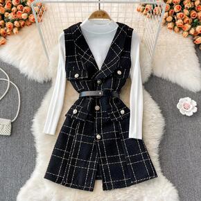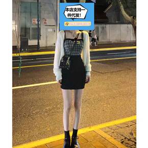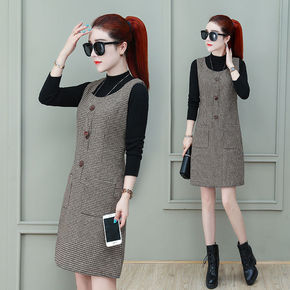 包邮毛呢连衣裙女时尚套装减龄秋冬新款格子吊带a字背...