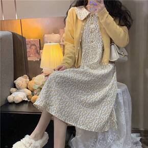 法式复古超仙吊带裙女2021秋季慵懒风毛衣显瘦碎花...