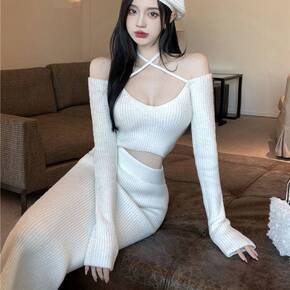 露肩挂脖毛衣半身裙套装女秋冬纯欲气质紧身短款上衣设...