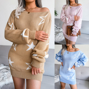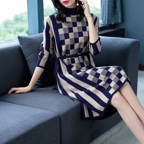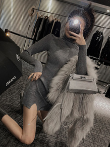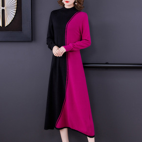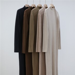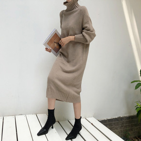 21秋冬新品女式针织衫长袖半高领打底中长款连衣裙弹...