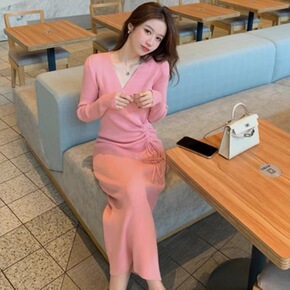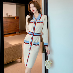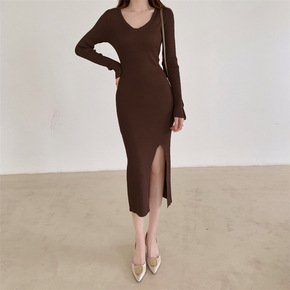 2021新款秋冬季针织连衣裙女显瘦毛衣裙气质v领打...