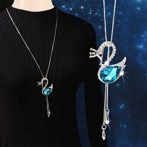 欧美时尚设计镶钻玫瑰花朵长款项链晚宴风气质毛衣链优...