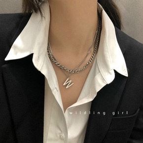 w字母吊坠项链卫衣潮嘻哈双层叠戴毛衣链长款百搭简约...