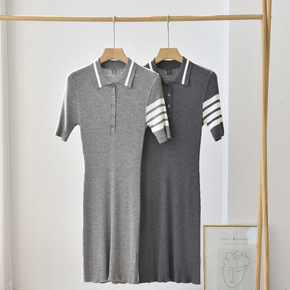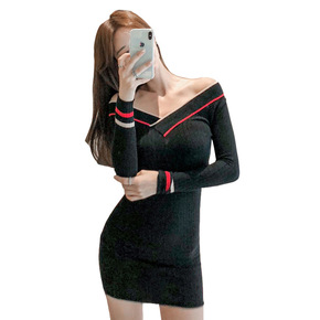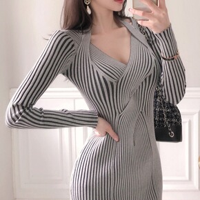 跨境女装2021名媛气质V领条纹针织修身毛衣包臀连...