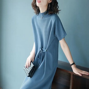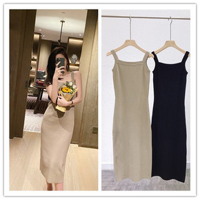 2990#2022春夏新款一字肩中长款针织连衣裙背...